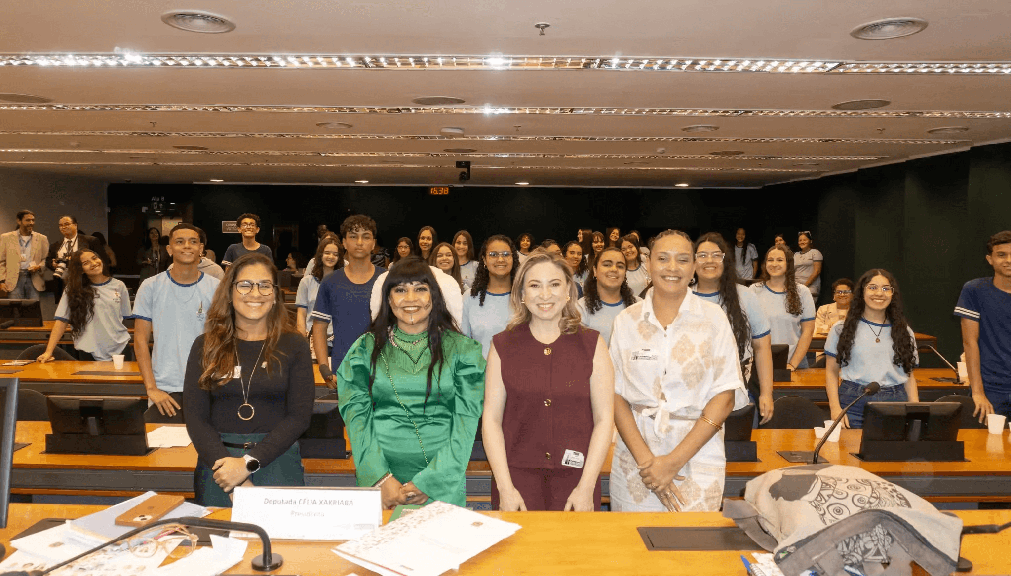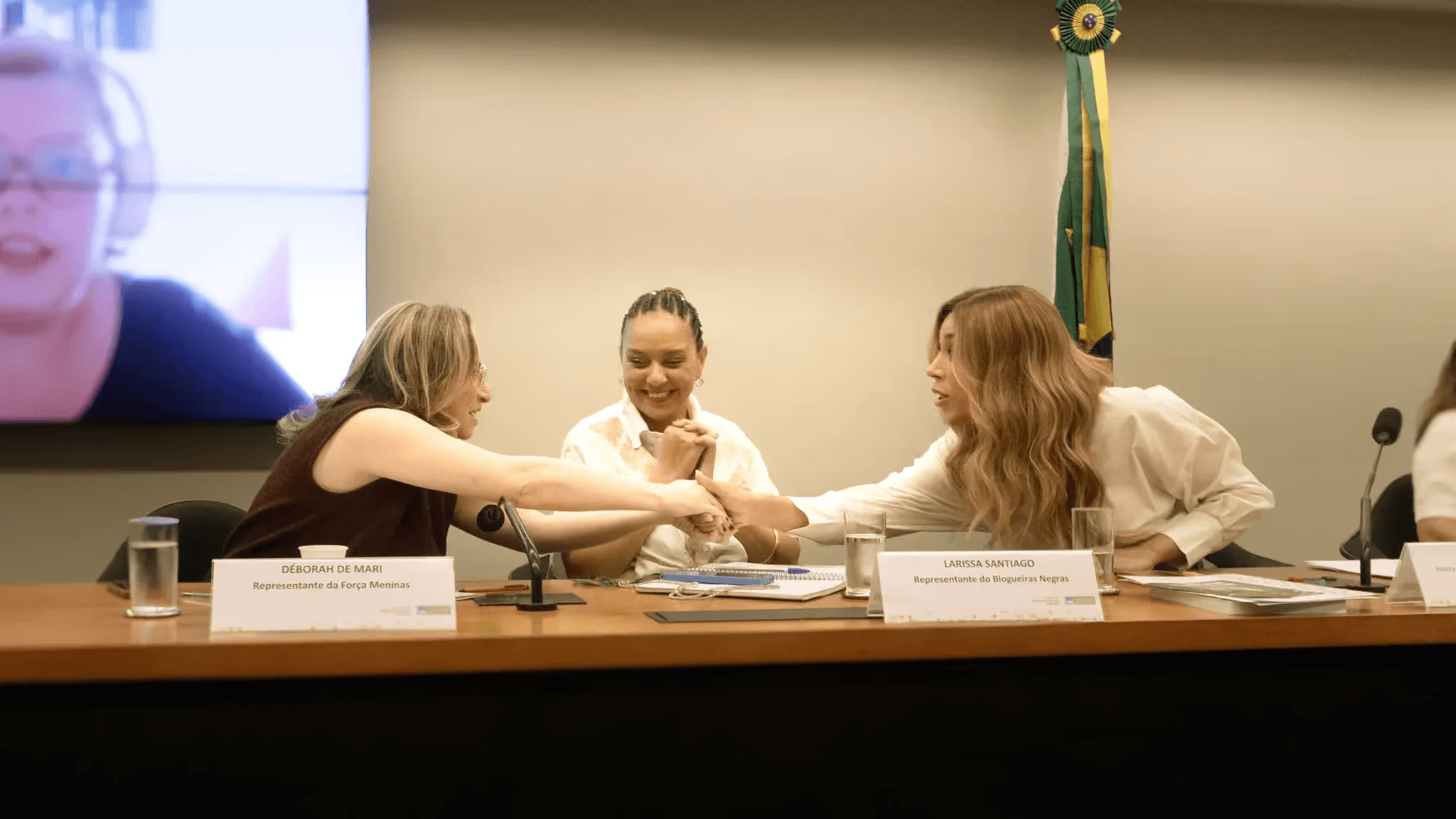 Déborah de Mari, CEO da Força Meninas, ao lado de parlamentares e lideranças, participa de audiência pública na Câmara dos Deputados sobre violência digital contra meninas.